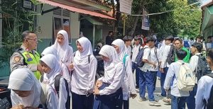 Jakarta Pusat – Aiptu Yuswanto sampaikan imbauan kepada pelajar yang pulang sekolah di SMP Taman Siswa Jalan Percetakan Negara VIII Cempaka Putih Jakarta Pusat. Jumat (19/7/2024)