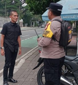 Jakarta Pusat – Bhabinkamtibmas Kelurahan Gondangdia Aiptu Kamidi berikan imbauan kamtibmas ke petugas keamanan jalan HOS Cokroaminoto Menteng Jakarta Pusat. Sabtu, (3/8/2024)
