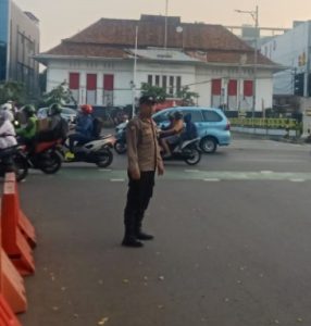 Jakarta Pusat – Unit Patroli Polsek Metro Gambir Aipda Erik melaksanakan pengaturan lalu lintas di Simpang Jl. Veteran Raya, Gambir, Jakarta Pusat. Senin (19/8/2024).