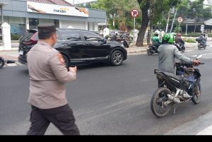 Jakarta Pusat- Dalam rangka meningkatkan pelayanan kepada masyarakat Aipda Andri Kapolsubsektor Sarinah membantu menuntun pengemudi motor di jalan Agus Salim Gondangdia Menteng Jakarta Pusat.