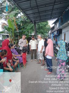 Jakarta Pusat – Bhabinkamtibmas Kelurahan Paseban Aiptu Ari Sanjaya bersama Sat Pol PP melaksanakan kegiatan Sambang dan Patroli Dialogis dipemukiman warga di Jalan Salemba Tengah RT 06 RW 08 Kelurahan paseban Kecamatan Senen Jakarta Pusat. Minggu (30/6/2024).