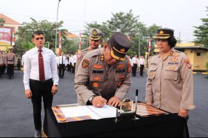 Kapolres Metro Bekasi Kota Kombes Pol Dani Hamdani S.I.K, M.P.M bertindak menjadi pimpinan kegiatan penandatanganan komitmen bersama lingkungan terjaga Polres Metro Bekasi Kota yang dilaksanakan di Mapolres Metro Bekasi Kota pada Senin (28/8/2023).