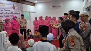 Kapolsek Kramatjati Kompol Rusit Malaka ,SH.I ,MH”memberikan santunan untuk anak yatim bersama – sama dengan PJU Polsek Kramatjati Jakarta Timur dan Ibu- Bhayangkari.