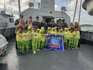 TNI AL, Bintan- Antusiasme Siswa/Siswi Paud Nurul Istiqomah, Lobam, Seri Kuala Lobam, Bintan, bisa melihat dan naik Kaapal Perang Republik Indonesia atau KRI dengan pengawasan oleh Prajurit Lanal Bintan dan Prajurit KRI Clurit-641 yang saat ini sandari di Dermaga Lanal Bintan Tanjung Uban, Sabtu (15/02/2025).