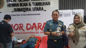 TNI AL, Belawan- Pangkalan Utama TNI AL I (Lantamal I) Belawan mengikuti donor darah dalam kegiatan Hari Bakti Karantina Ke-147 Tahun 2024, bertempat di Kantor Balai Besar Karantina Pertanian, Jalan Sulawesi II, Ujung Baru, Medan, Kota Belawan, Selasa(15/10/2024).