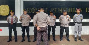 Jakarta Pusat – Kanit Sabhara AKP Samsul Bahri mengambil apel pengamanan depan Kantor KPU RI jalan Imam Bonjol No.29 Menteng Jakarta Pusat.Jum’at (05/7/2024)