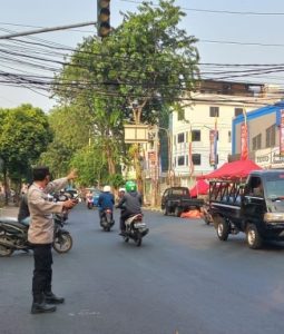 Meneriskan pesan Kapolres Metro Jakarta Pusat Kombes Pol Susatyo Purnomo Condro, S.H., S.I.K., M.Si., melalui Kapolsek Johar Baru Kompol Ubaidillah, S.H., M.A., untuk membantu kelancaran arus lalu lintas di wilayah Johar Baru.