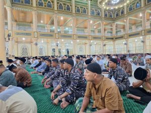 TNI AL, Simeulue- Danlanal Simeulue Letkol Laut (P) Oyu Mulia Sukmana, S.T., M.T., M.Tr.Opsla., yang diwakili oleh Dandenpom Lanal Simeulue Kapten Laut (PM) Sukardi, menghadiri acara Peringatan Nuzulul Qur’an yang diselenggarakan oleh Pemerintah Kabupaten Simeulue tahun 1446 H/2025 M, bertempat di Masjid Tengku Khalilullah, Desa Air Dingin, Kecamatan Simeulue Timur, Kabupaten Simeulue, Minggu (16/3/2025).