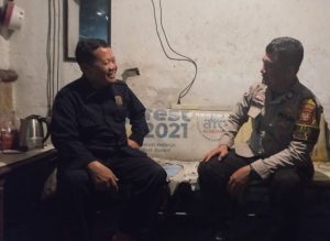 Aiptu Suhartono selaku Bhabinkamtibmas bertemu petugas kamling Imam menyampaikan himbauan agar waspada dan lebih ditingkatkan untuk pengawasannya / Patroli di wilayahnya, identifikasi gangguan seperti tawuran, curas, curat dan curanmor.
