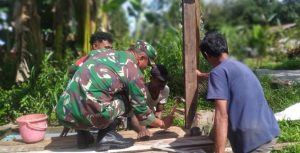 Timika – Guna terciptanya sinergitas TNI bersama rakyat, Babinsa Koramil 07/Mapurujaya Kodim 1710/Mimika, Koptu Redemtus melaksanakan karya bakti membantu pembangunan rumah milik warga binaannya di Jalan Poros Mapurujaya, Kelurahan Wania, Distrik Mimika Timur, Kab. Mimika. Kamis (18/7/2024).