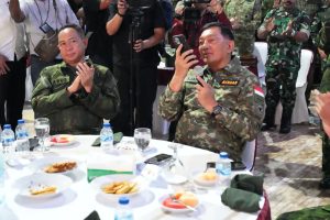 (Puspen TNI)Panglima TNI Jenderal TNI Agus Subiyanto mendampingi Menteri Pertahanan RI Sjafrie Sjamsoeddin dalam kegiatan doa bersama prajurit TNI yang sedang bertugas di daerah operasi, yang digelar di Markas Yonif 754/Eme Neme Kangasi, Timika, Papua Tengah, Jumat (17/10/2025). Kegiatan yang berlangsung secara khidmat ini diikuti oleh prajurit dari tiga matra dengan penuh semangat kebersamaan dan rasa syukur.