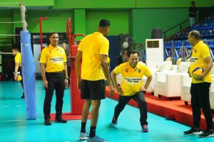 Kapolri dan beberapa atlet dari Proliga berkesempatan mencoba lapangan yang akan digunakan dalam turnamen bola Voli piala Kapolri tersebut.
