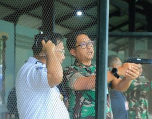 Makassar – Komandan Lanud Sultan Hasanuddin Marsma TNI Bonang Bayuaji G., S.E., M.M., CHRMP, bersama Kepala Imigrasi Makassar, Abadi Widodo Subagio, General Manager (GM) Bandara Internasional Sultan Hasanuddin, Minggus E.T. Gandeguai, General Manager Airnav Kristanto, dan Kepala Otaritas Bandara Udara Wilayah V Makassar, Dr. Asri Santoso, melaksanakan latihan menembak pistol eksekutif di Lapangan Tembak Atmaji Lanud Sultan Hasanuddin, Kamis (4/07/2024).